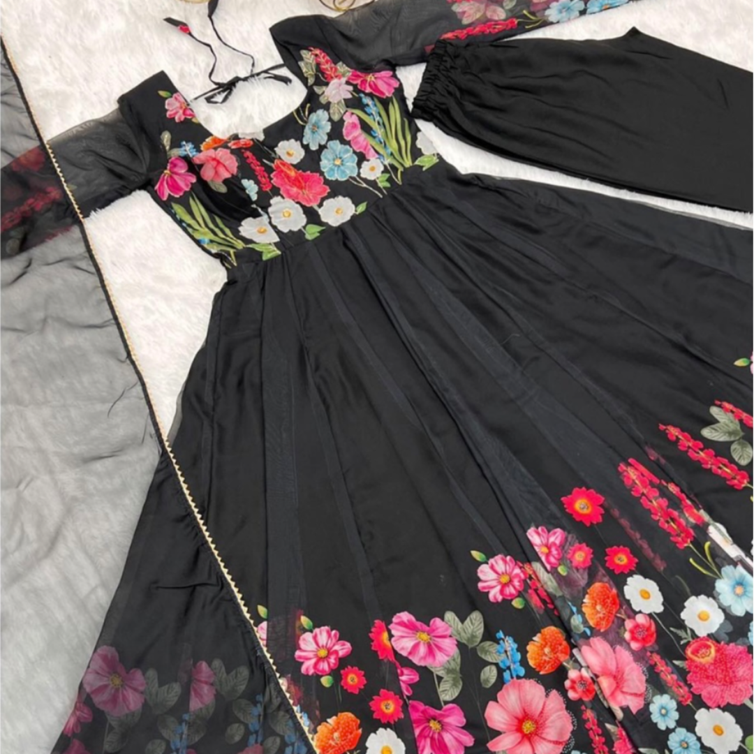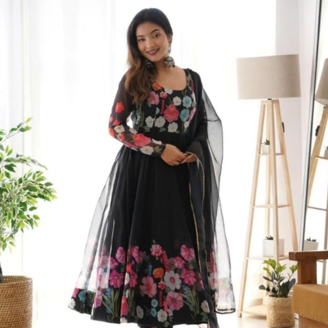 *Launching This Timeless And Classic Black Floral Printed Organza Anarkali Suit Set For The Upcoming Festivities And Wedding Season*