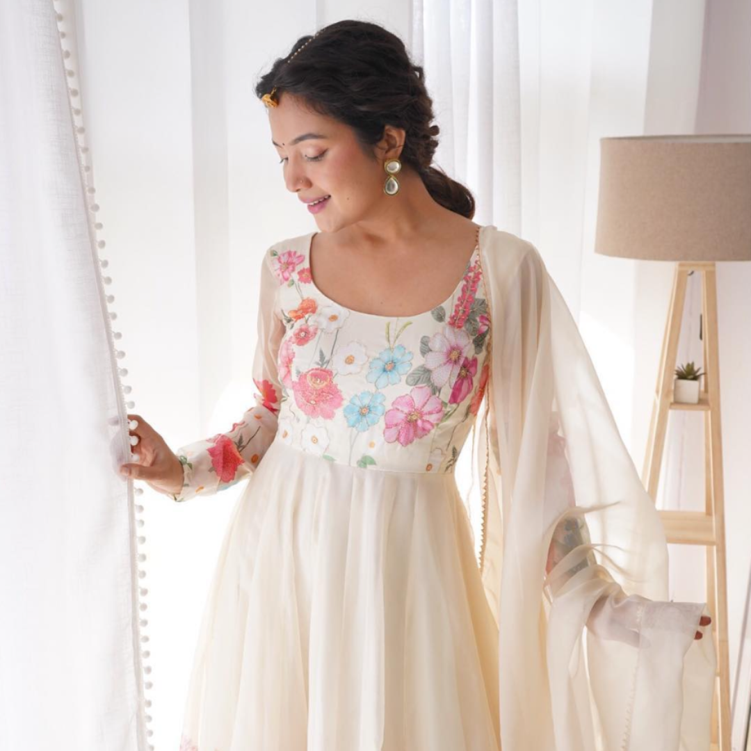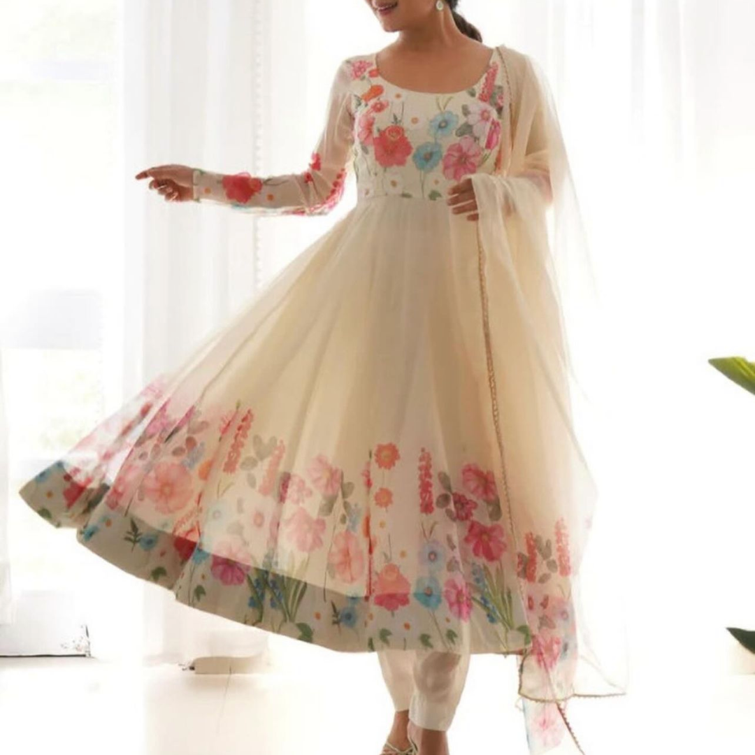 *Pure Soft Organja Silk Fabric Fully Flair Kali Pattern And Canvas Patta With Duppta Set ,pent Ready To Wear* Anarkali Fabric: Heavy Pure Soft Organja Silk Print